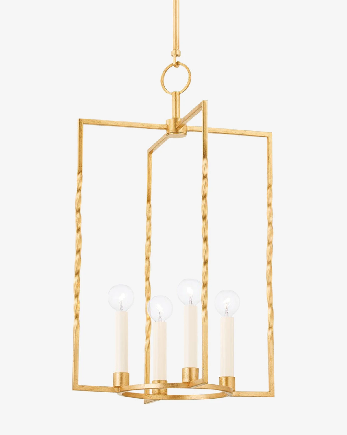 The Adelaide Lantern is inspired by traditional design but given a modern update through its mix of both circular and linear forms and its contemporary candelabra. A twisted metal frame with four lights in either a vintage gold leaf or textured black finish, this lantern is a beautiful addition to the entryway, dining, or kitchen area.
