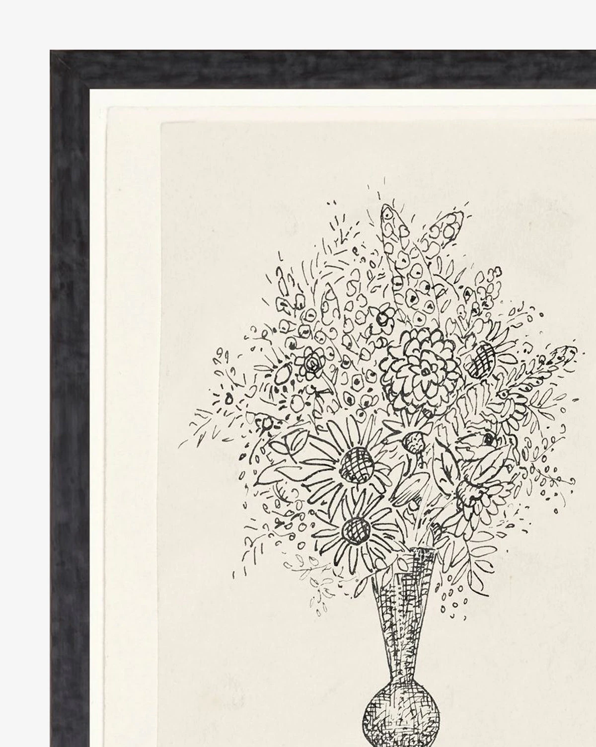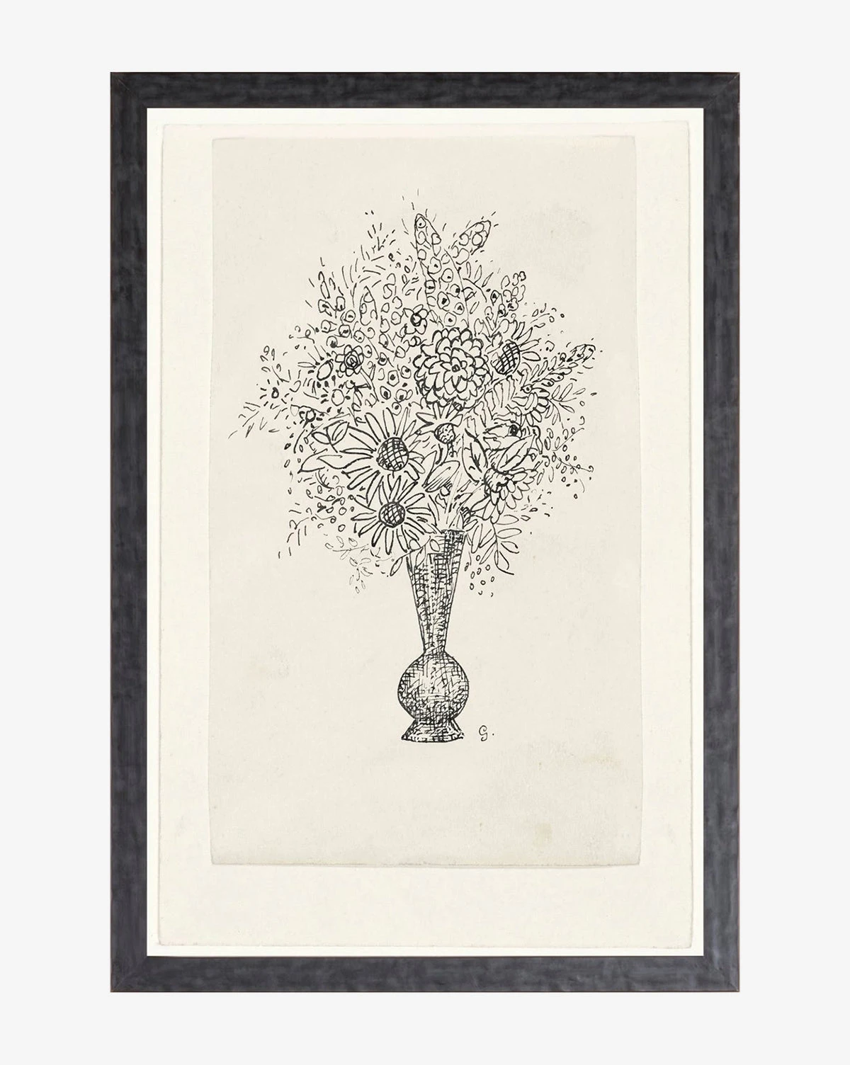 A historically inspired sketch and frame, the Black & White Bouquet adds character to your rooms. Fine line details and an imaginative collection of flowers bring to life a whimsical garden through this still-life drawing.