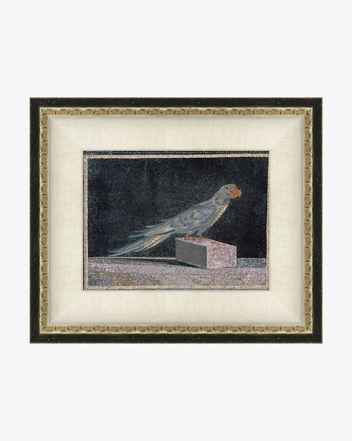 An intricate giclee print of a mosaic, Blue Parrot is a unique study in detail. With aquatic blue and neutral stone hues, this coastal artwork is complemented by a distressed black and silver finished wood frame.