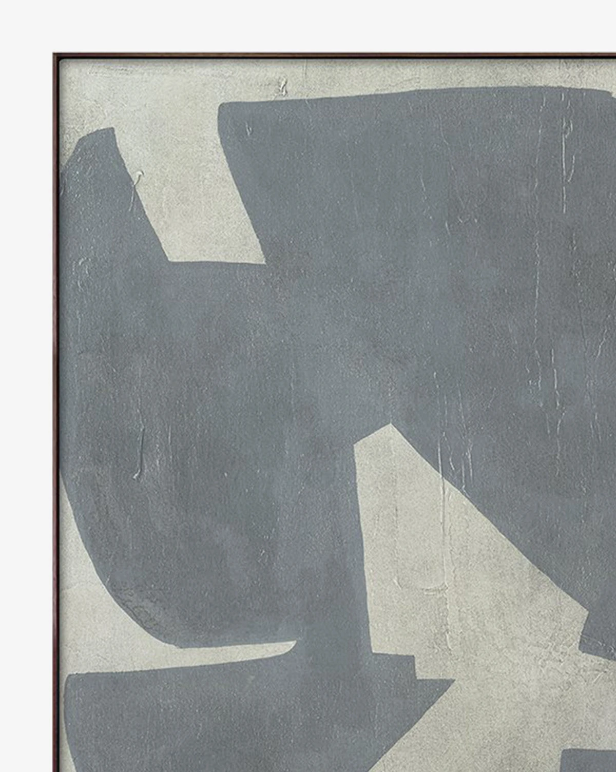 With muted tones of blue and light tan, Blue & White Abstract makes a statement wherever it is placed. With geometric elements that create visual contrast across its composition, to smooth curves that give this piece a calming appeal, this abstract piece brings a sophisticated modern element to your decor.