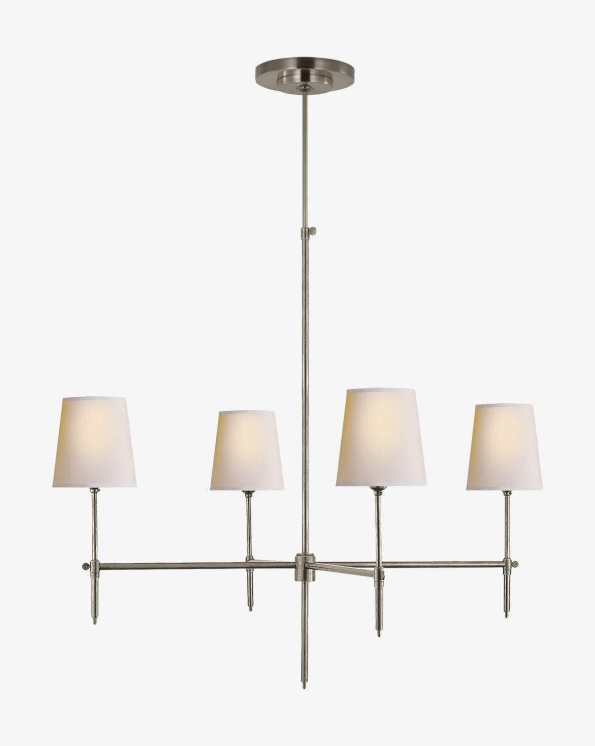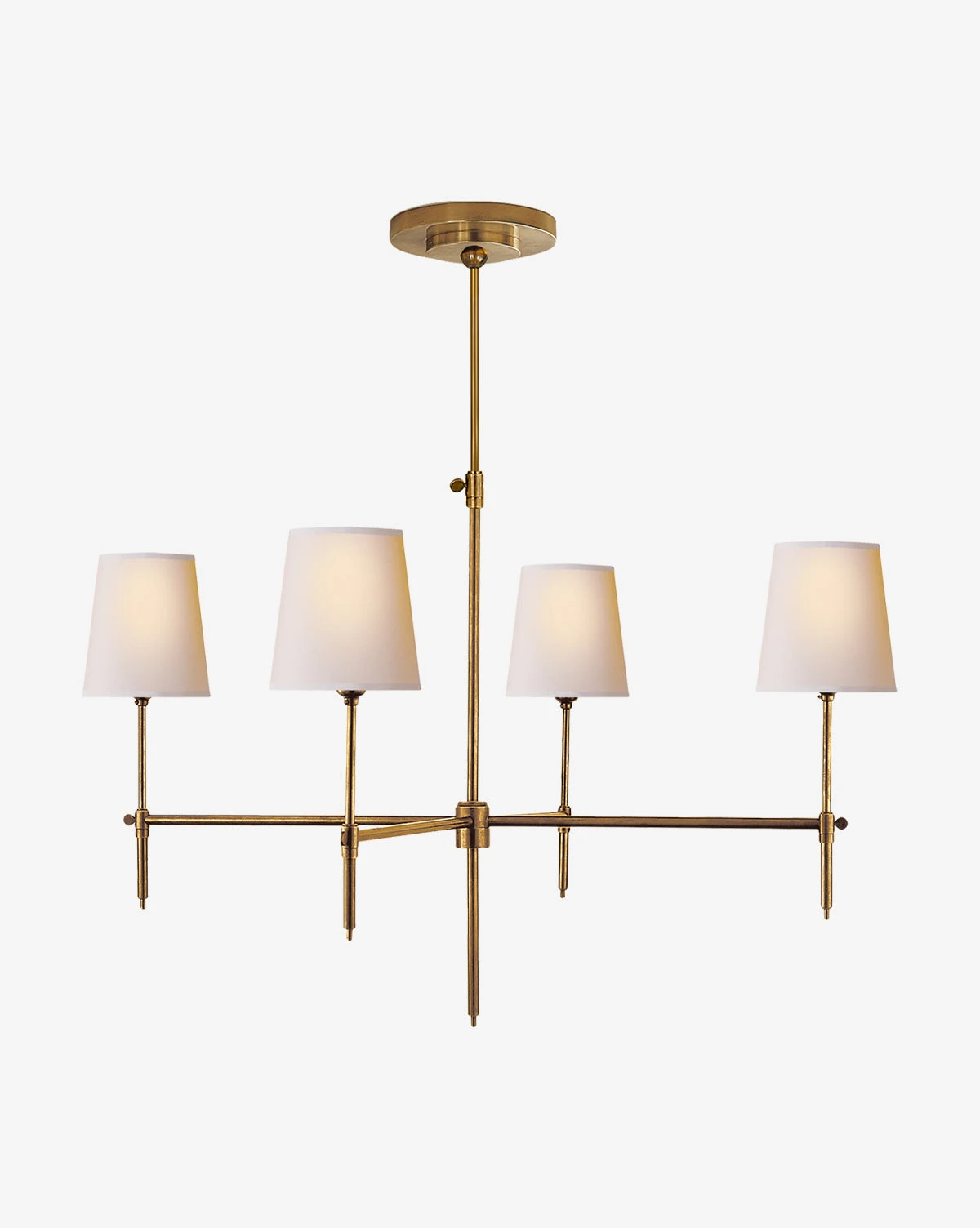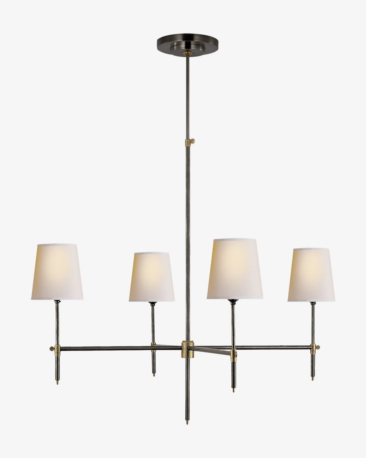 Simple and streamlined in design, the Byrant Large Chandelier is a classic addition to any space. The elegant structure and tapered linen shades of this fixture blend seamlessly with any existing decor wherever it is styled.