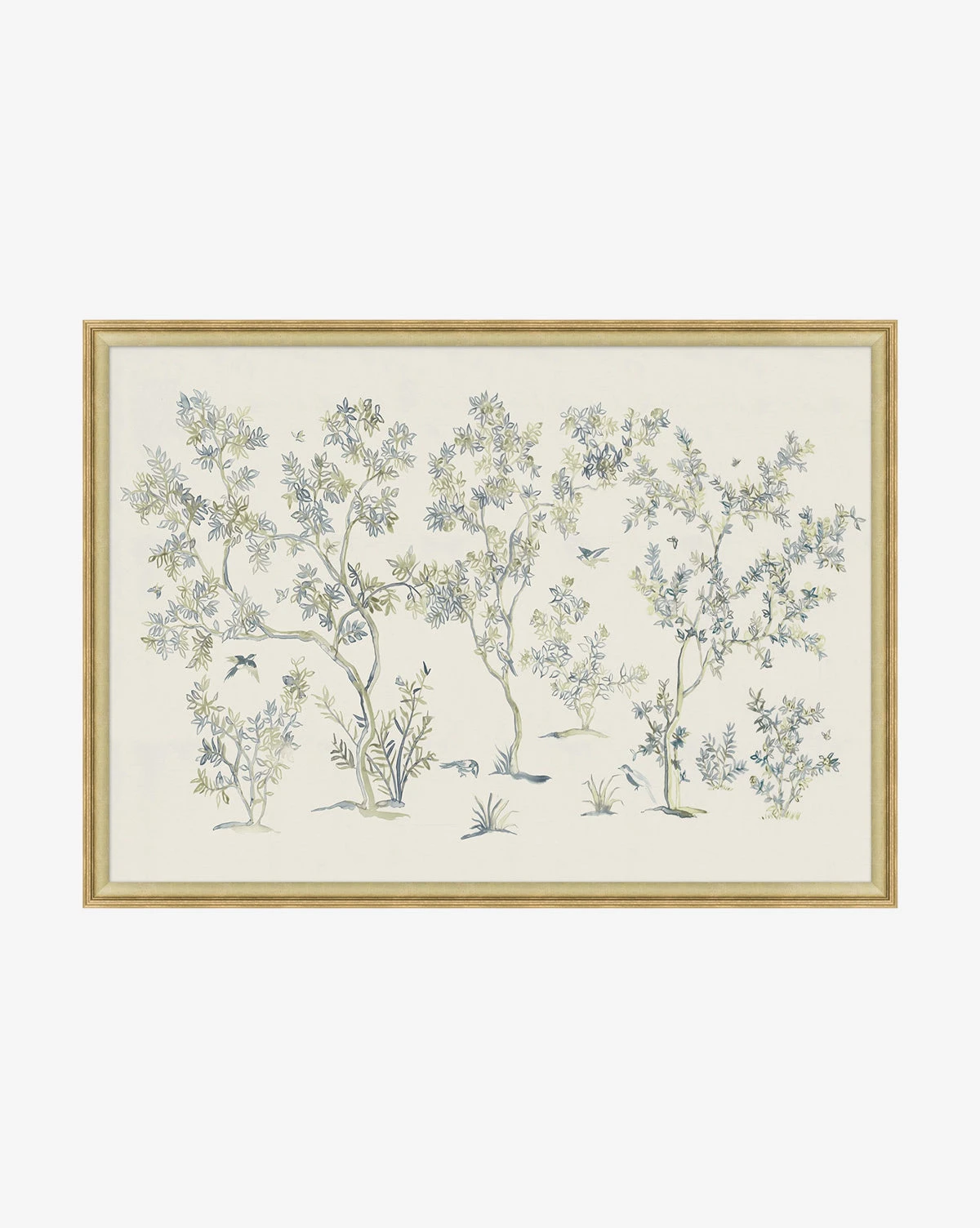 Chinoiserie Trees displays fine brushwork of a summer tree-filled garden. With blue and earthy greens, the giclee print on matte paper brings brightness anywhere it is displayed. A gold-finished frame completes the piece and contributes to its joyful aesthetic.