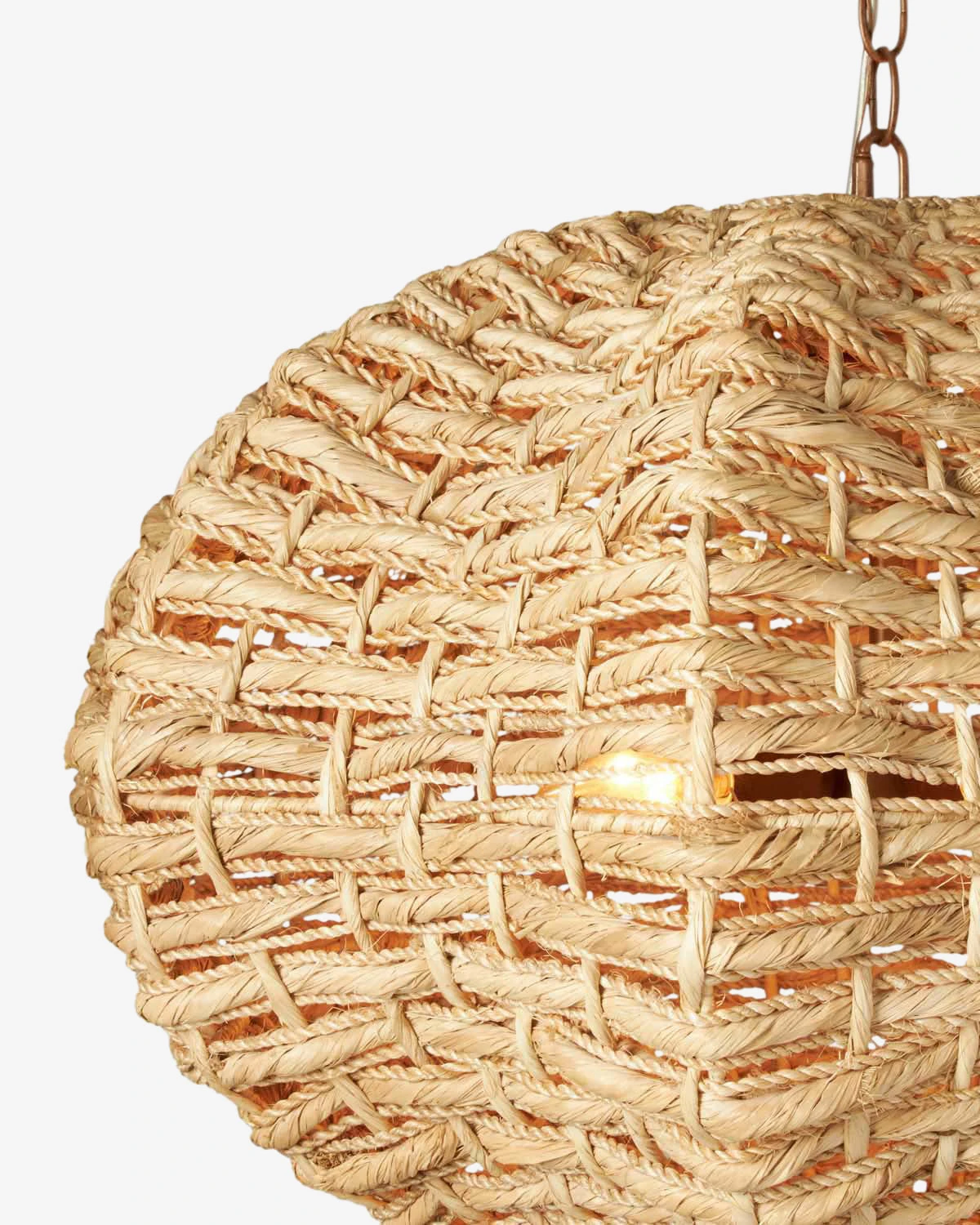 Crafted from woven abaca and raffia, the Eridian Chandelier presents itself as a celebration of texture in your space. Abstract and sculptural, this fixture makes a statement while adding an organic feel and warm light to a room.