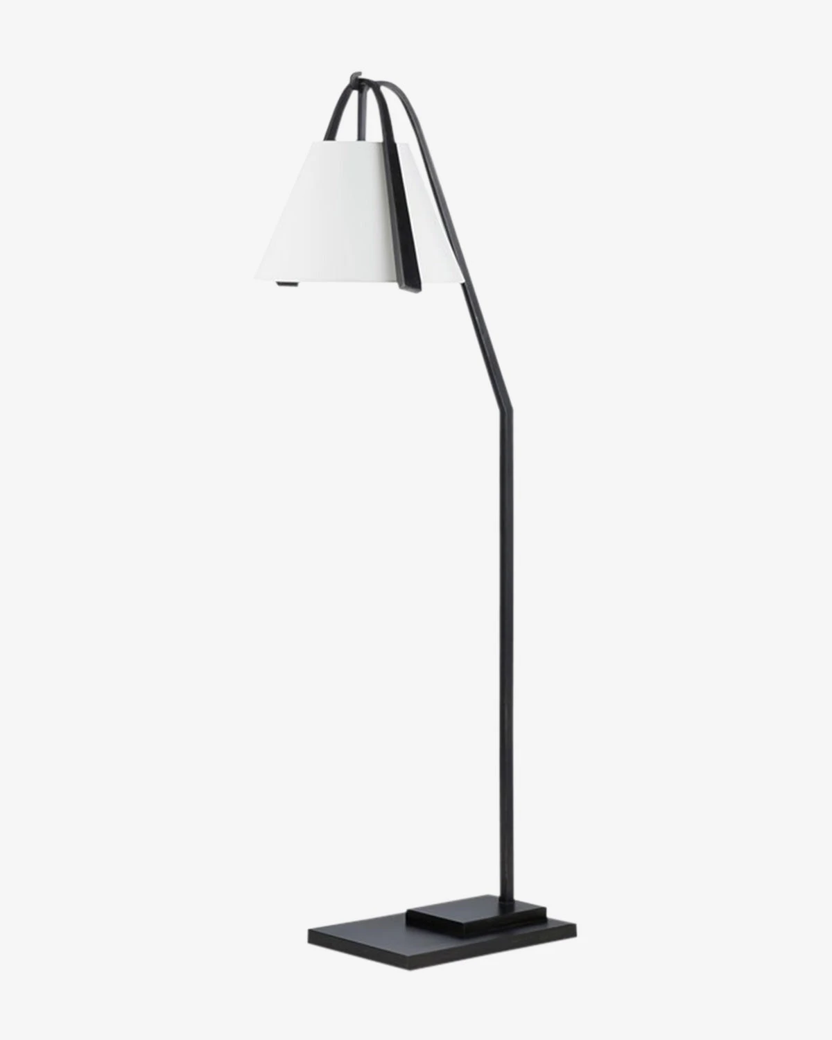 Masterfully crafted in a contemporary design, the Frey Floor Lamp is made of steel in a satin black finish. The off-white shantung shade is fitted to the curved arm with creativity, complementing the stacked geometric base.