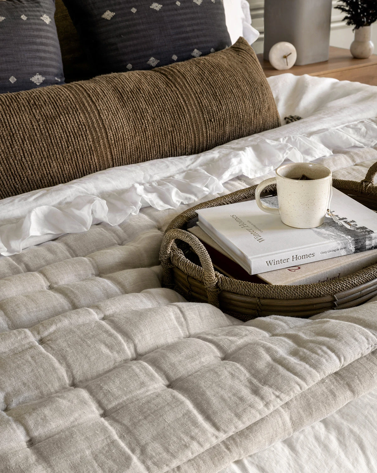Textural and neutral, the Graywash Wicker Tray is crafted from wicker and abaca fiber rope. Its oval shape is sleek and elegant, easy to style on your console or coffee table. With mixed woven patterns, the tray brings refined organic detail to your space.