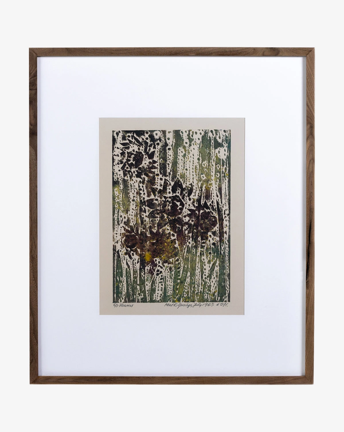 Green Florals is playfully intricate, representing a 1963 piece by Latvian artist, Pepi Sprohge. A scene of flowers in a rich palette, the piece brings life and contemporary creativity to your space. With handmade construction and a rustic walnut frame, the piece brings gallery quality wherever it is styled.