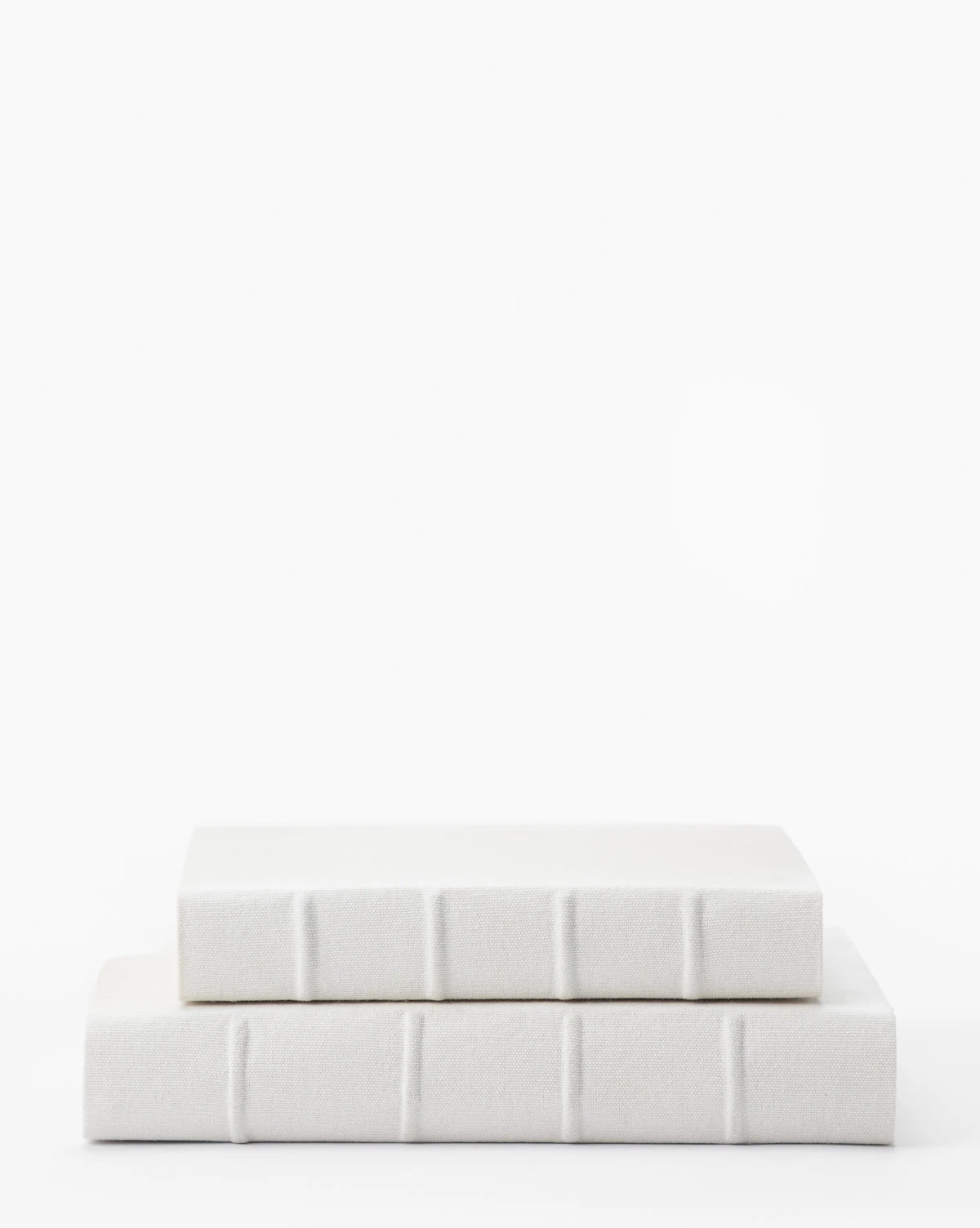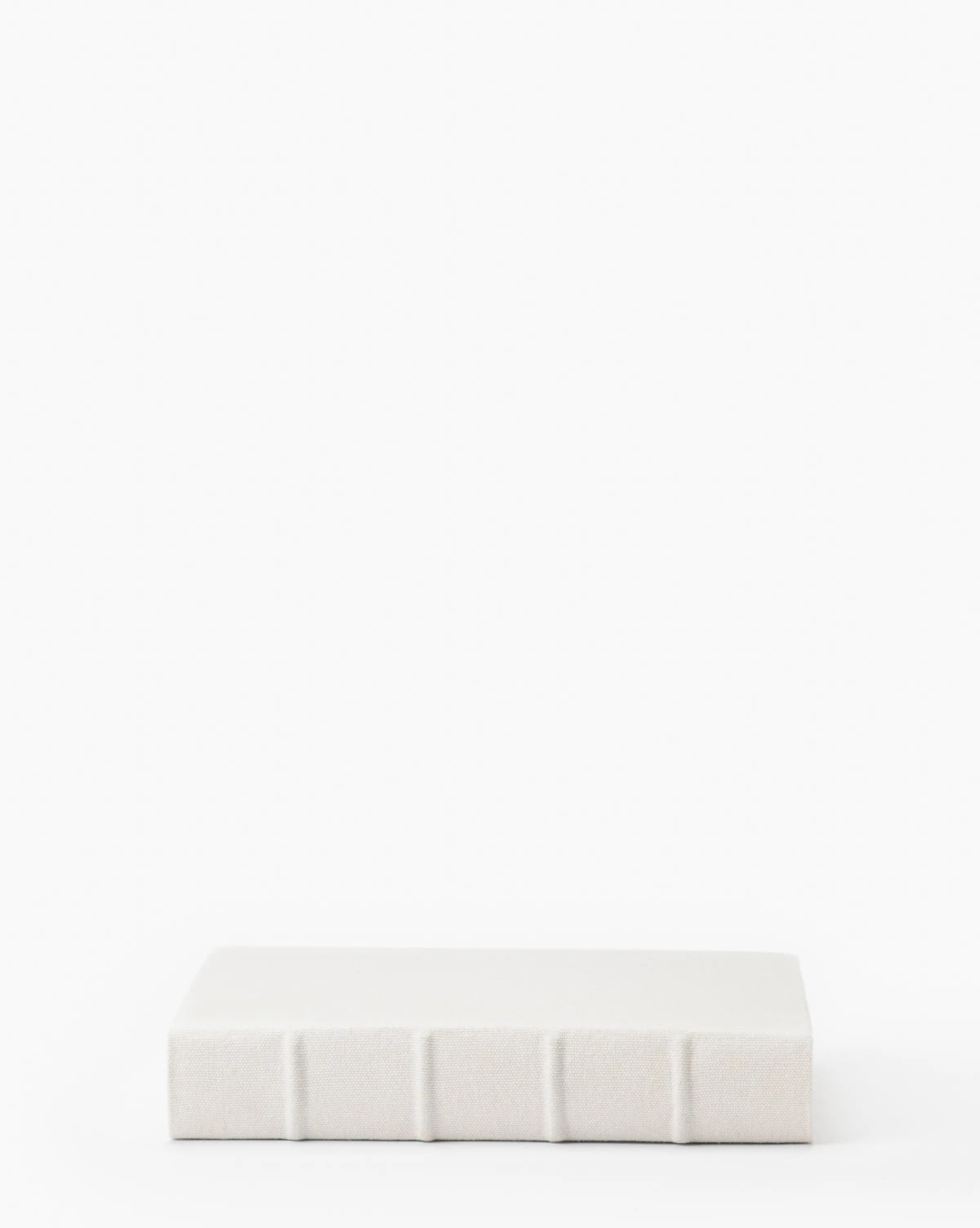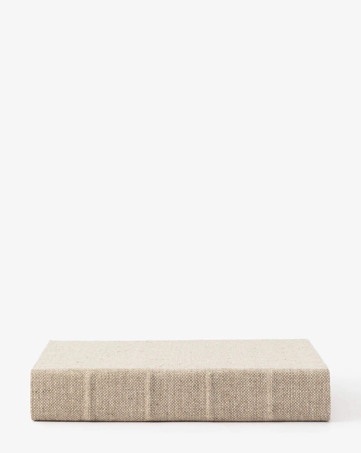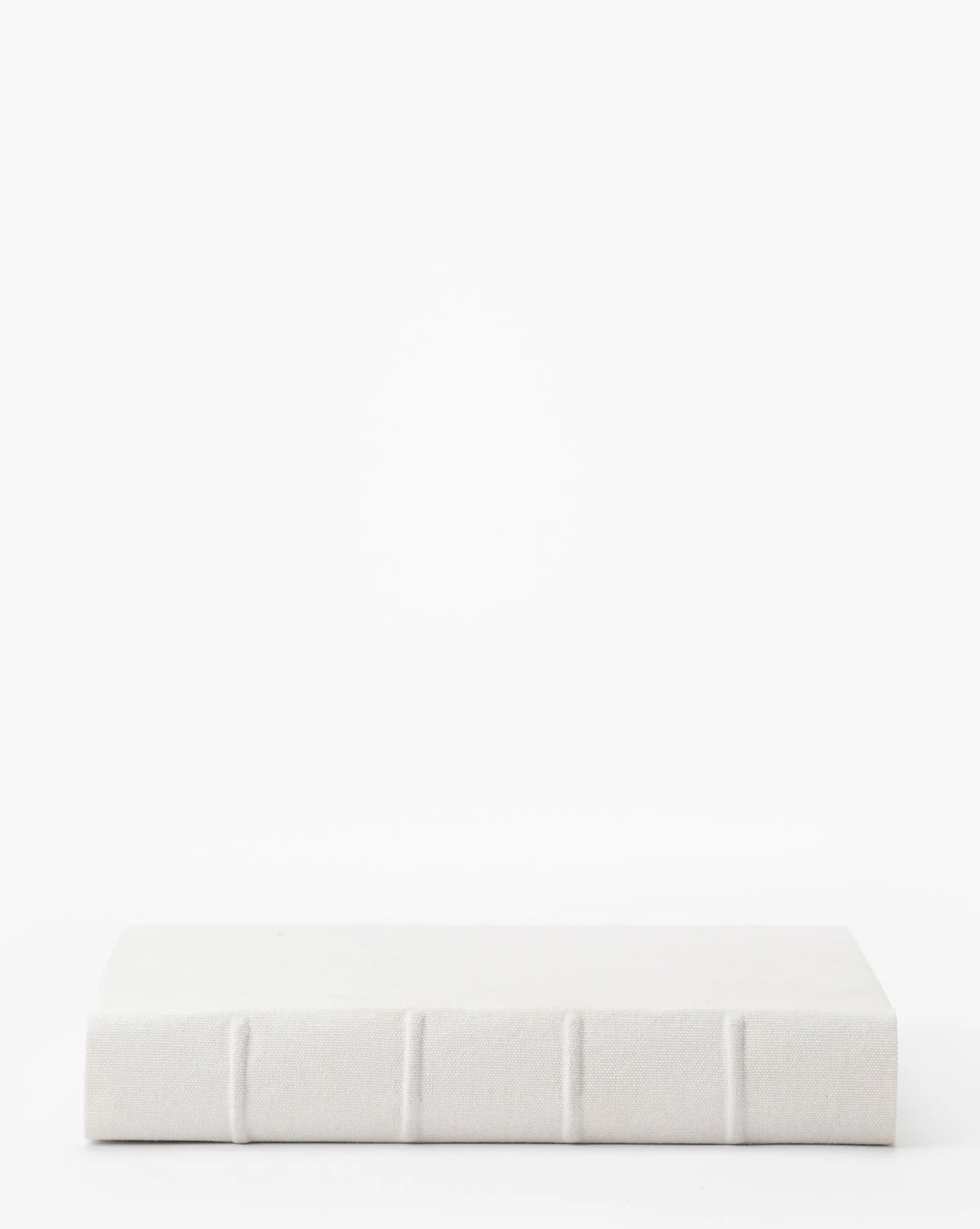 With linen fabric and handmade paper, the Handcrafted Linen Book fills out your styling with an academic, sophisticated look. Its traditional binding holds its white two-toned linen fabric, giving a warm touch of texture wherever it is styled.
