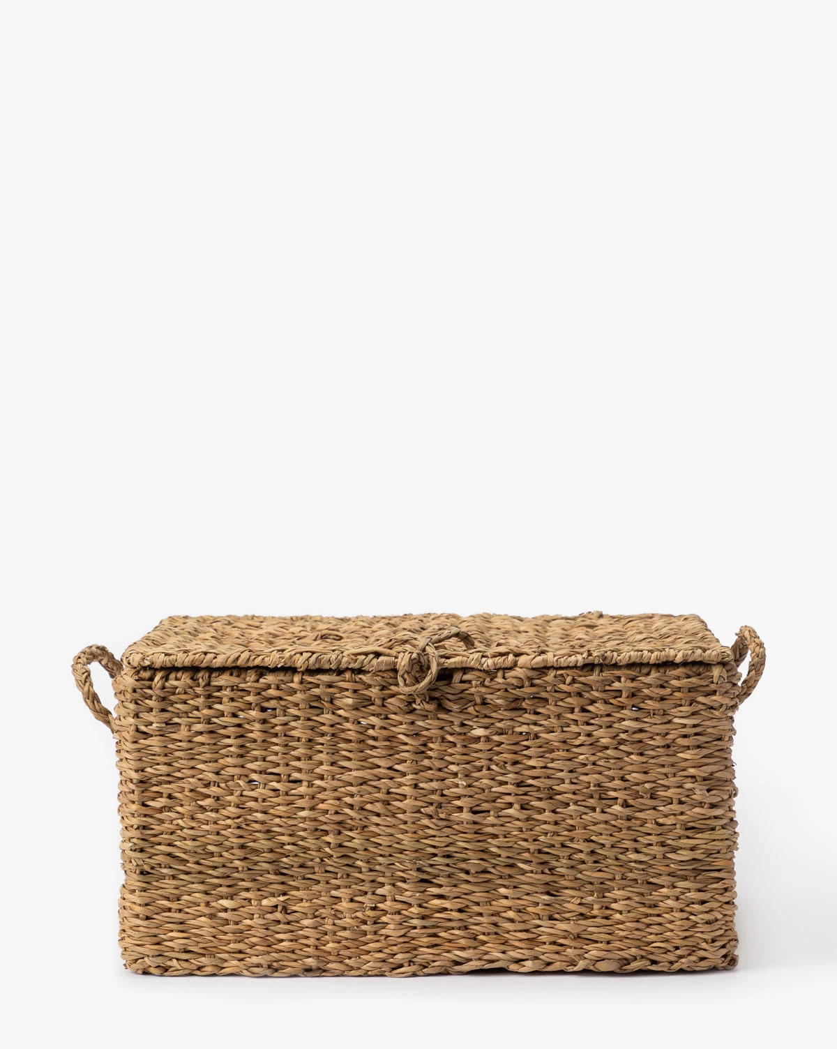 Made from hand-woven seagrass within a simple frame, the Kya Seagrass Boxes boast rustic detail. With a woven clasp and woven handles, the decorative boxes delicately contribute an organic feel to a shelf or console vignette.
