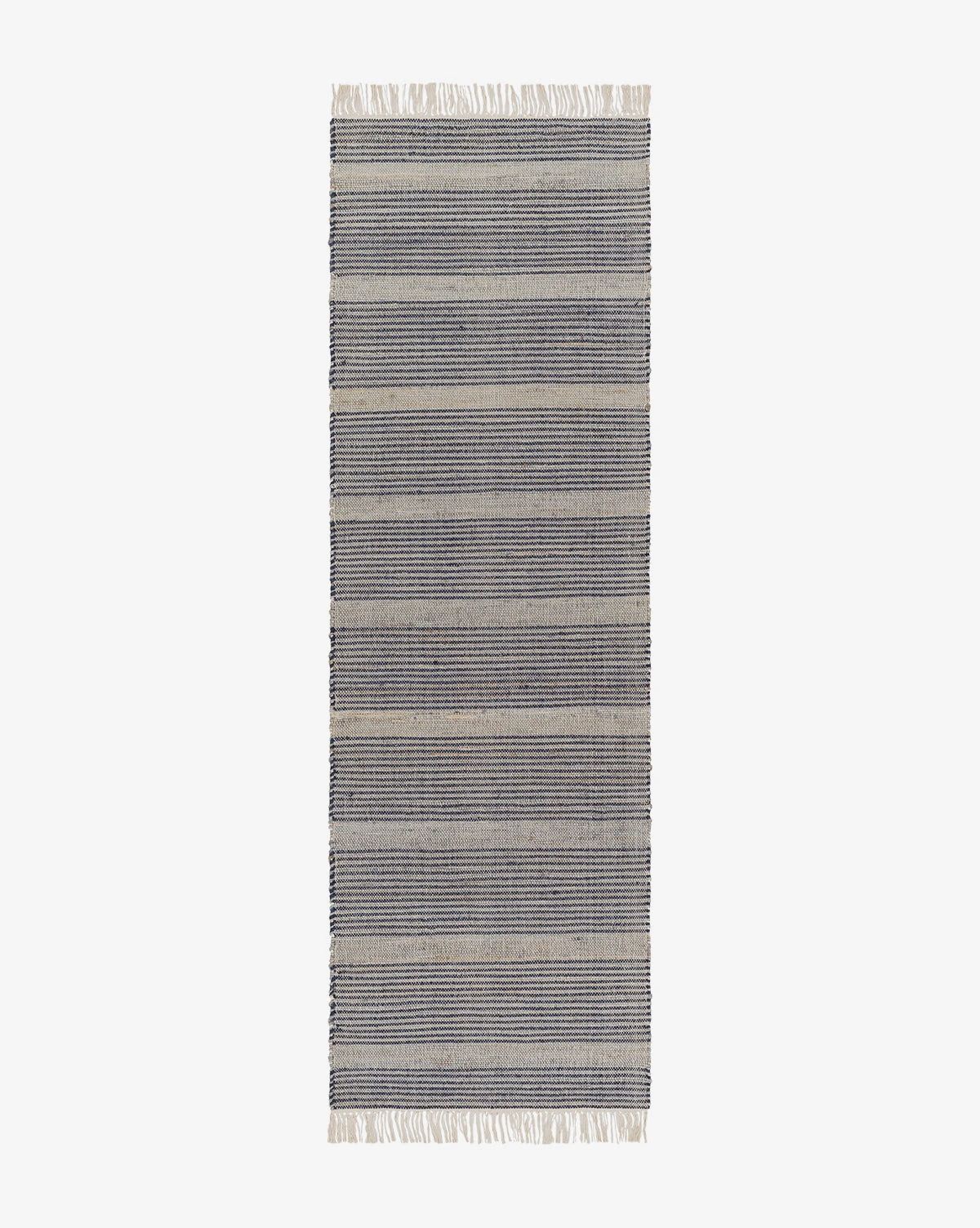With an organic feel, the Mayon Navy Handwoven Rug brings both texture and dimension to your space. Made from a blend of jute and cotton, the striped motif of this rug is simple yet sophisticated, featuring navy, slate, and off-white tones.