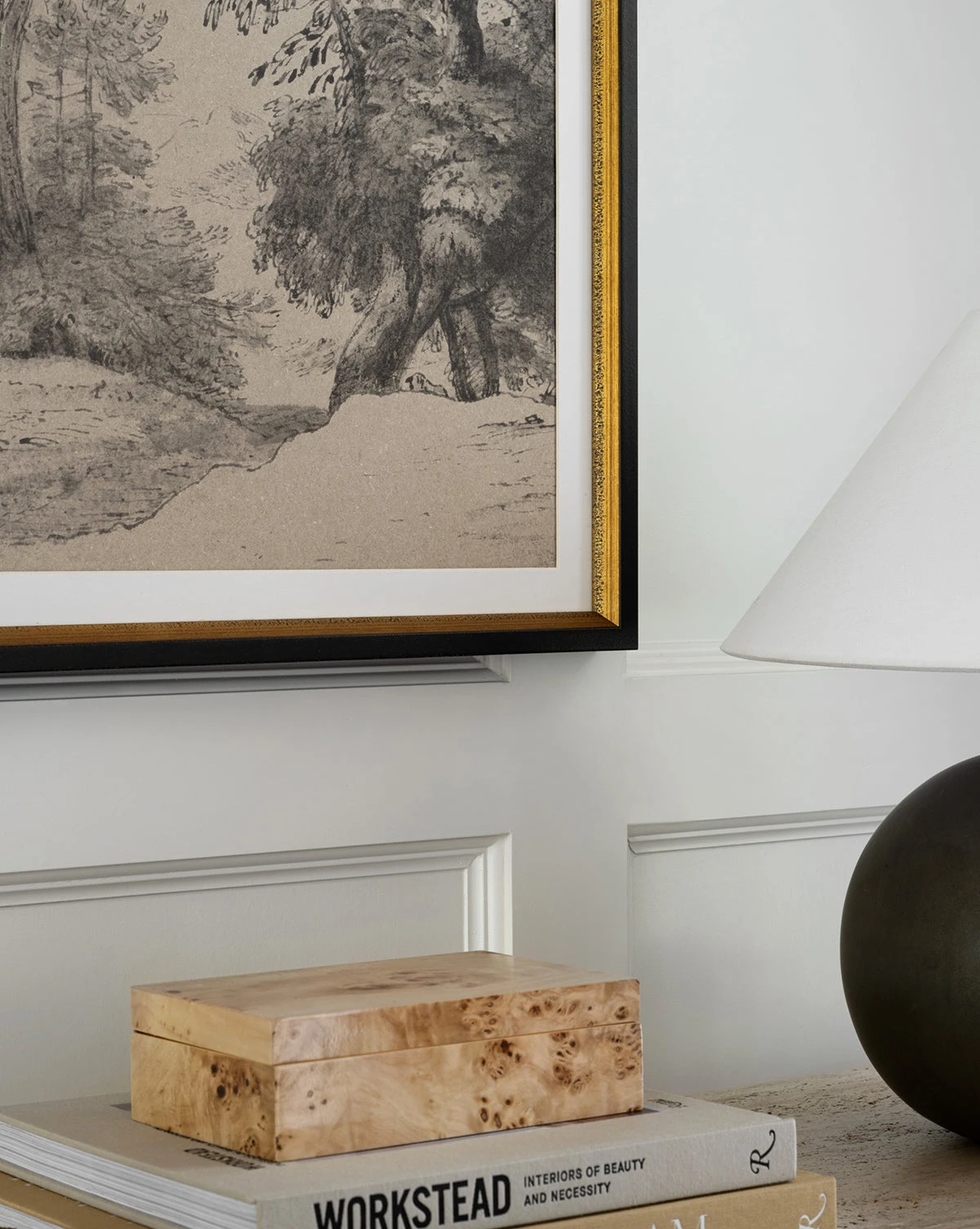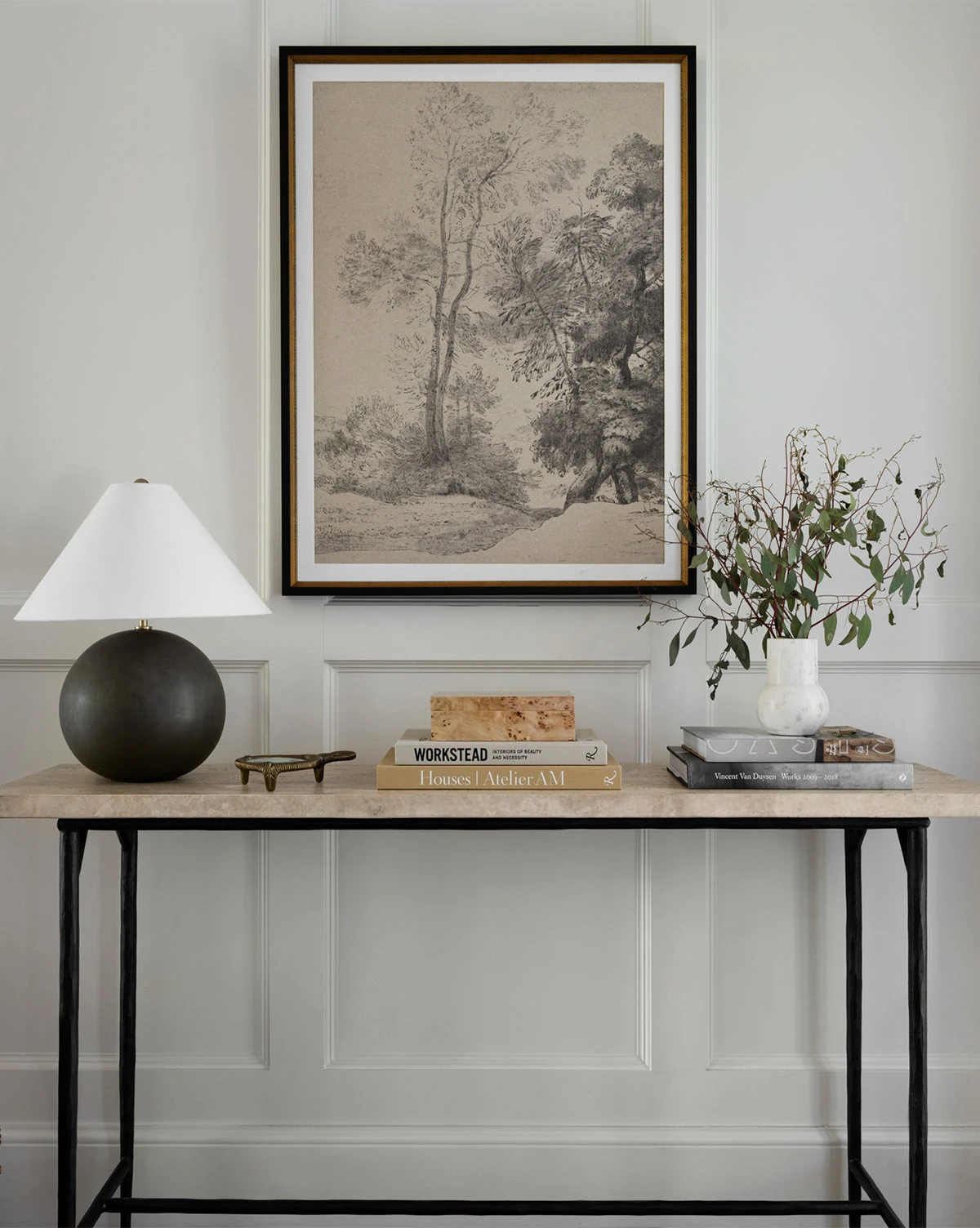 Detailed and moody, Pastoral Sketch has a vintage look with delicate lines that give its rustic landscape character and movement. The sketch is mounted on a single mat and encased in glass. Its wood frame with a distressed black and antique gold finish complements the piece, giving it a museum-quality feel.