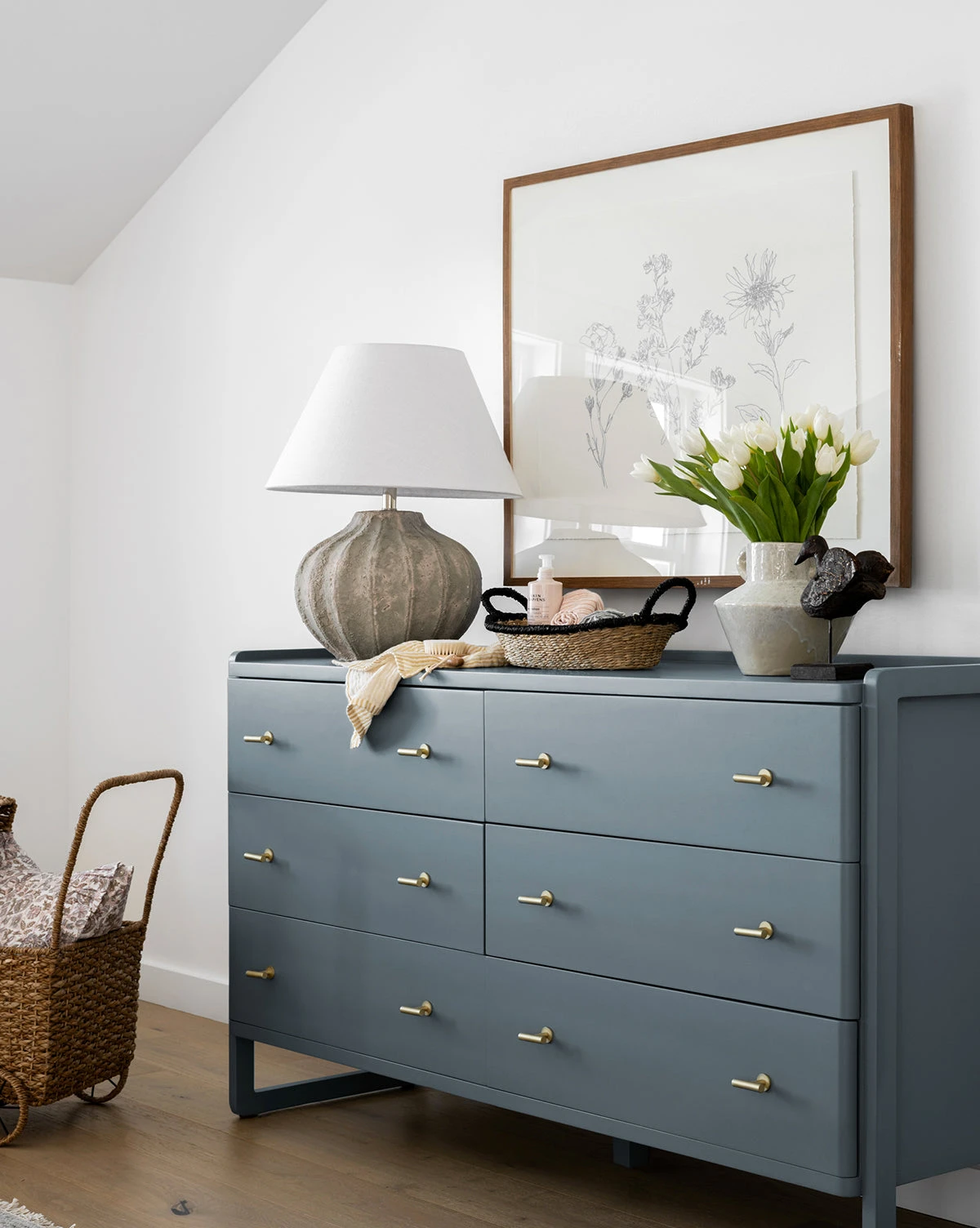 Sketched in a deep, slate blue on white deckled paper, Petits Fleurs depicts three species of flowers in an airy style. The raw nature of the physical print contrasts with the delicate nature of its linework and is completed with a thin wood frame in a natural finish. Its thin, intentional lines explore the intricacy and elegance of each flower, bringing a gentle touch to the room.