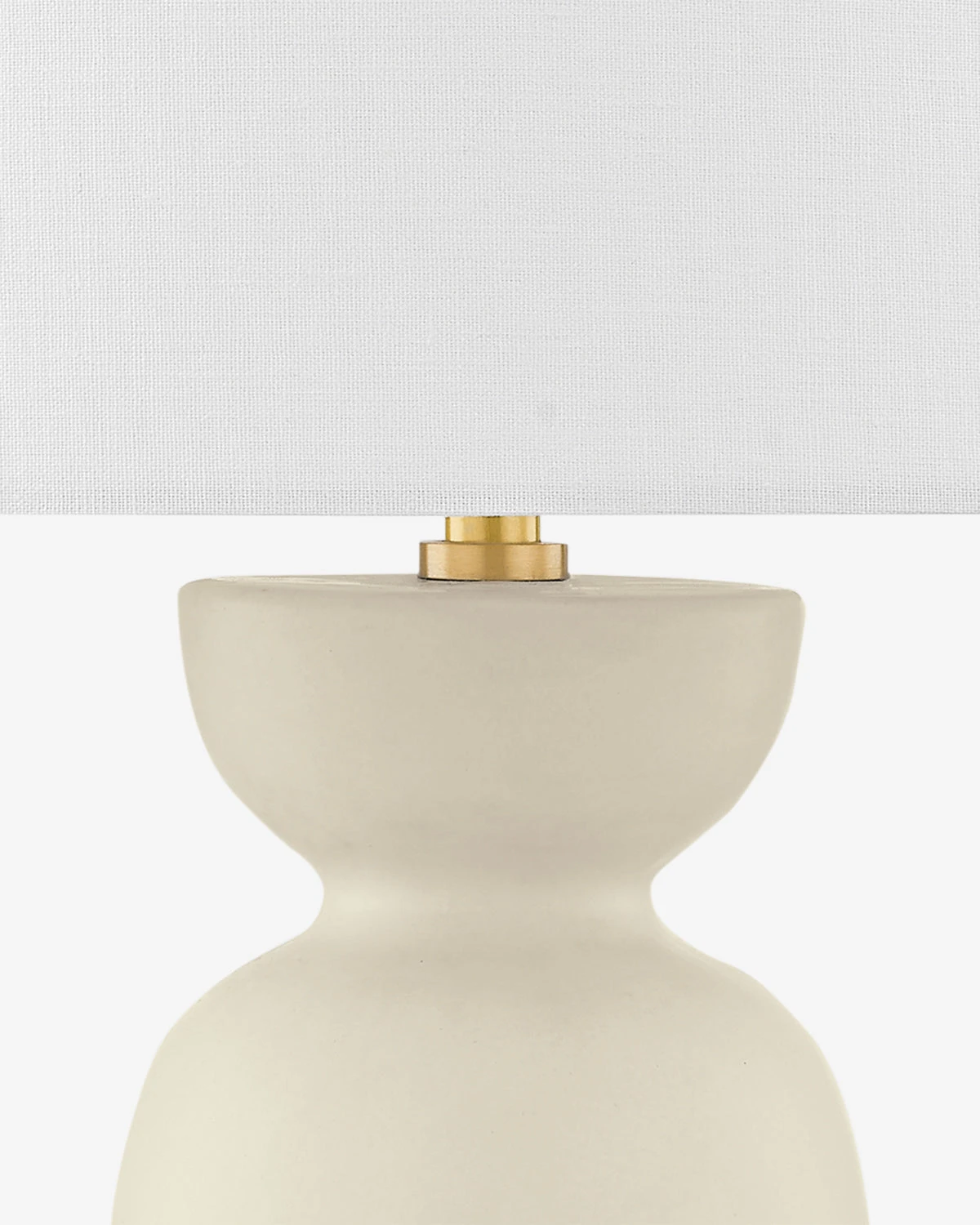 With a creatively designed glazed ceramic base, the Rhea Table Lamp is elegant and detailed. Its neutral tone allows for its artful elements to shine and its white ivory shade provides warm light for your space, whether styled on a console or side table.
