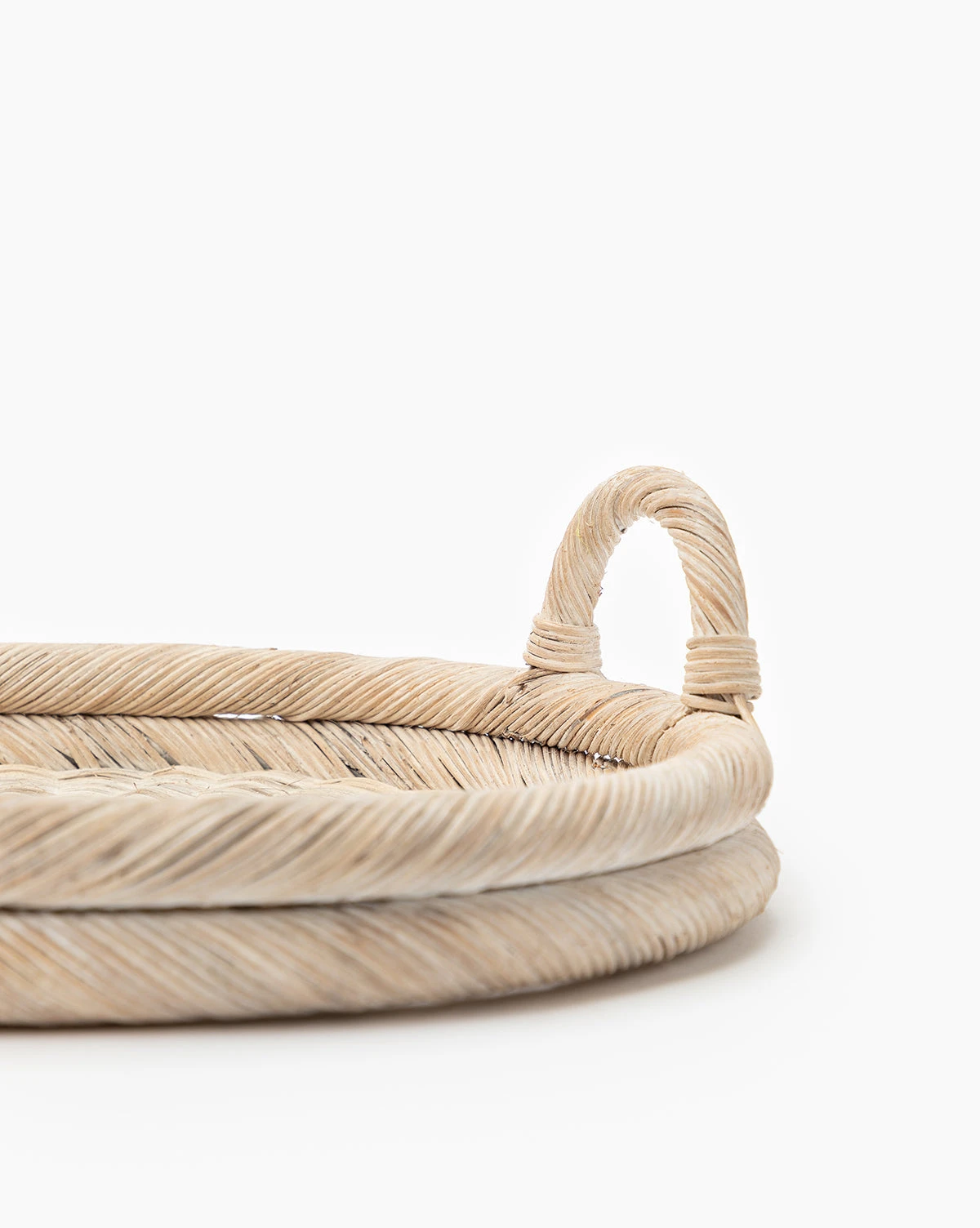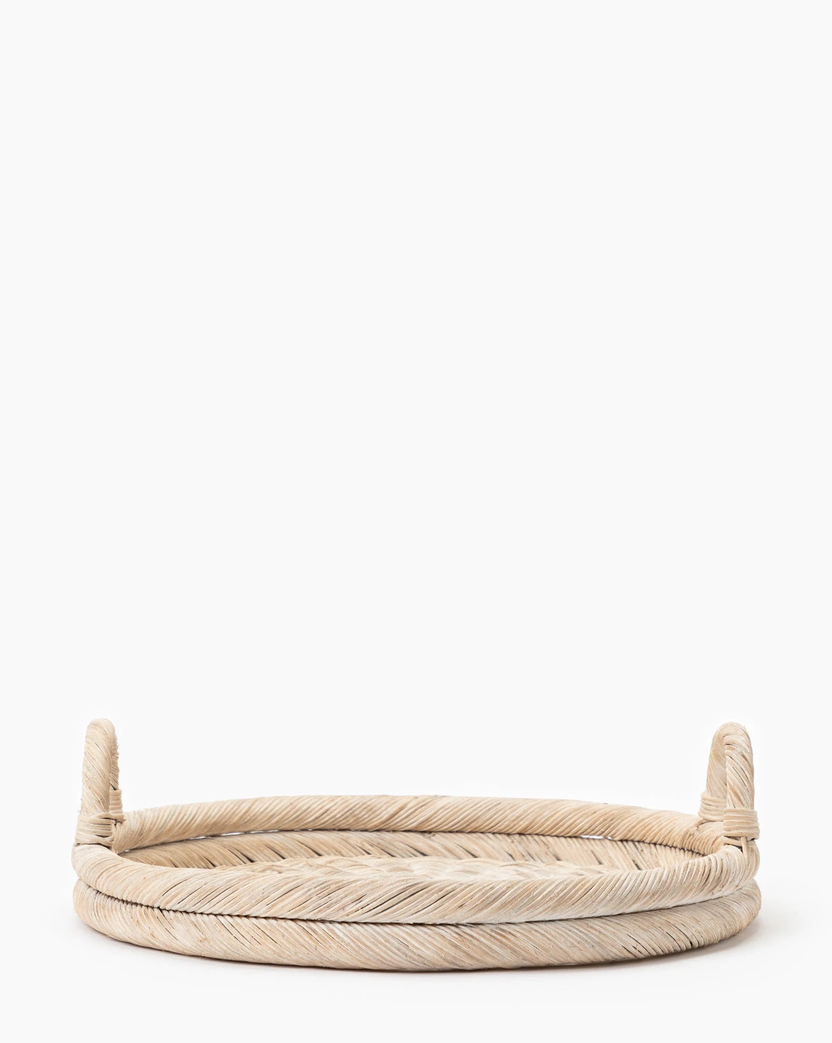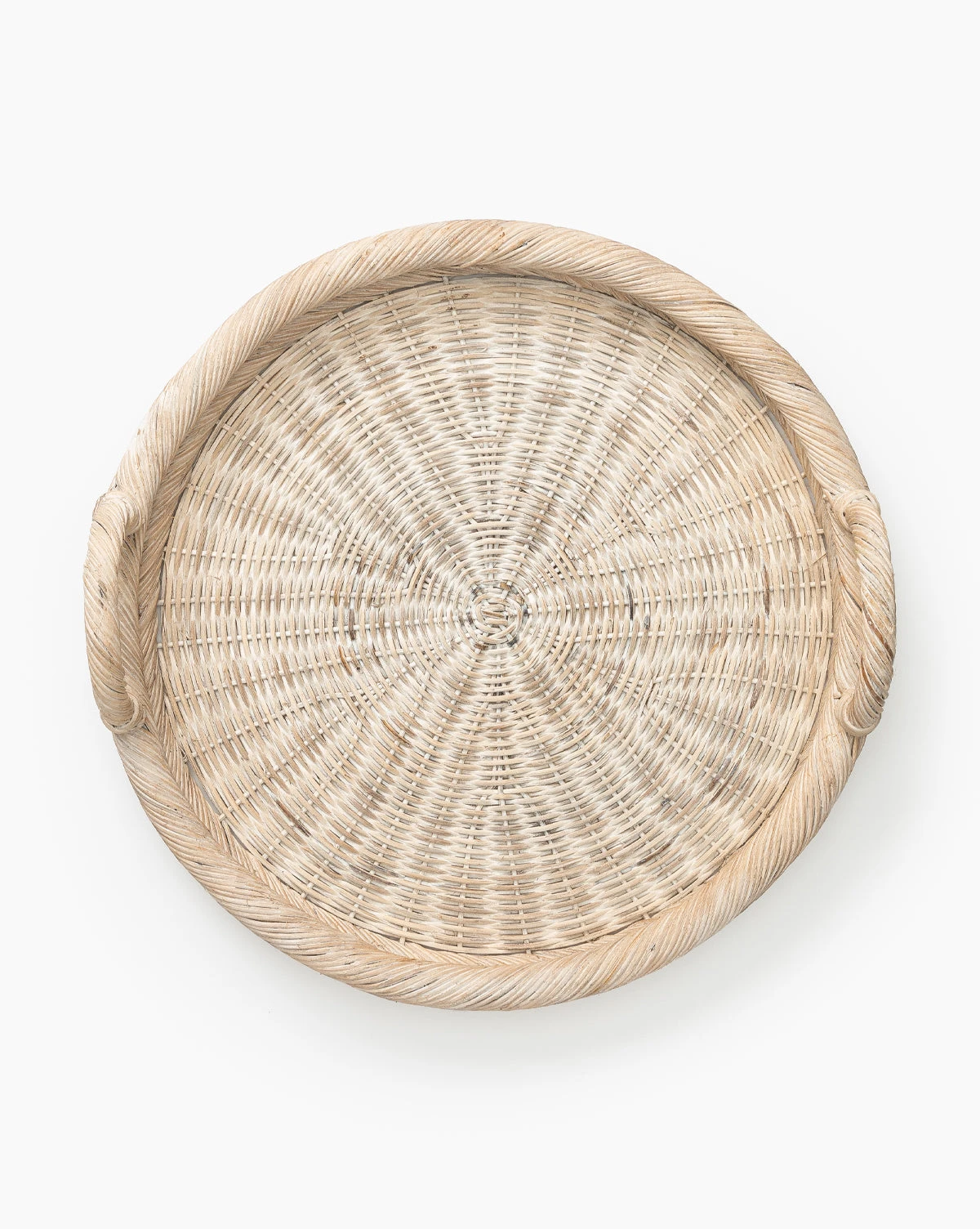 Crafted from whitewashed wicker, the Round Wicker Tray is a textural and neutral feature for a console or coffee table vignette. Its light palette and intricately woven pattern give this tray a coastal feel that will seamlessly suit your style throughout the seasons.