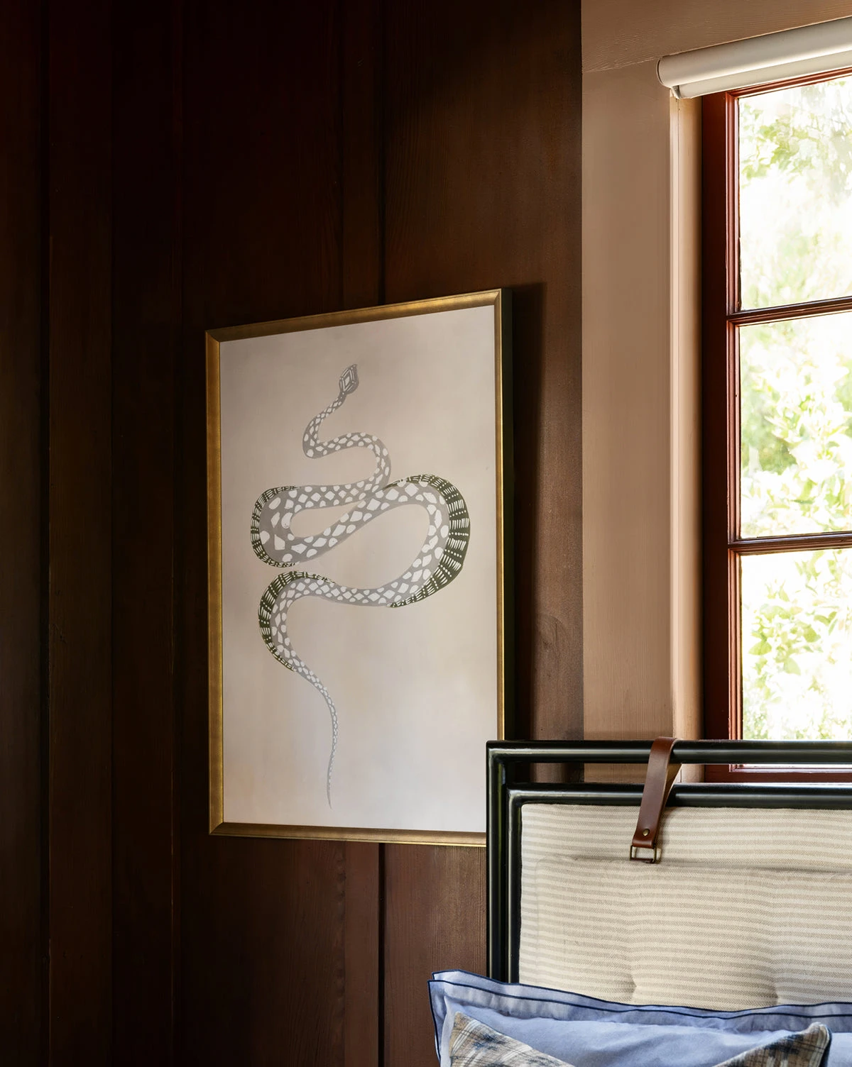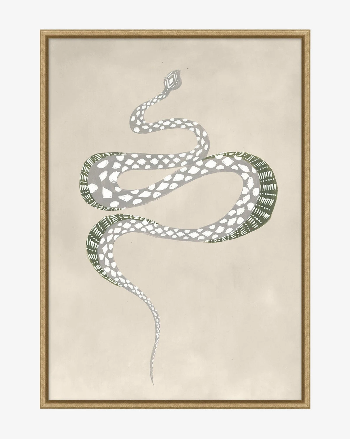 A colorful depiction of a snake, Serpent II is captivating and expressive, reminiscent of imaginative illustrations. Framed within a wood frame with a scaled texture gold finish, the piece is a charming accent to any children’s room.
