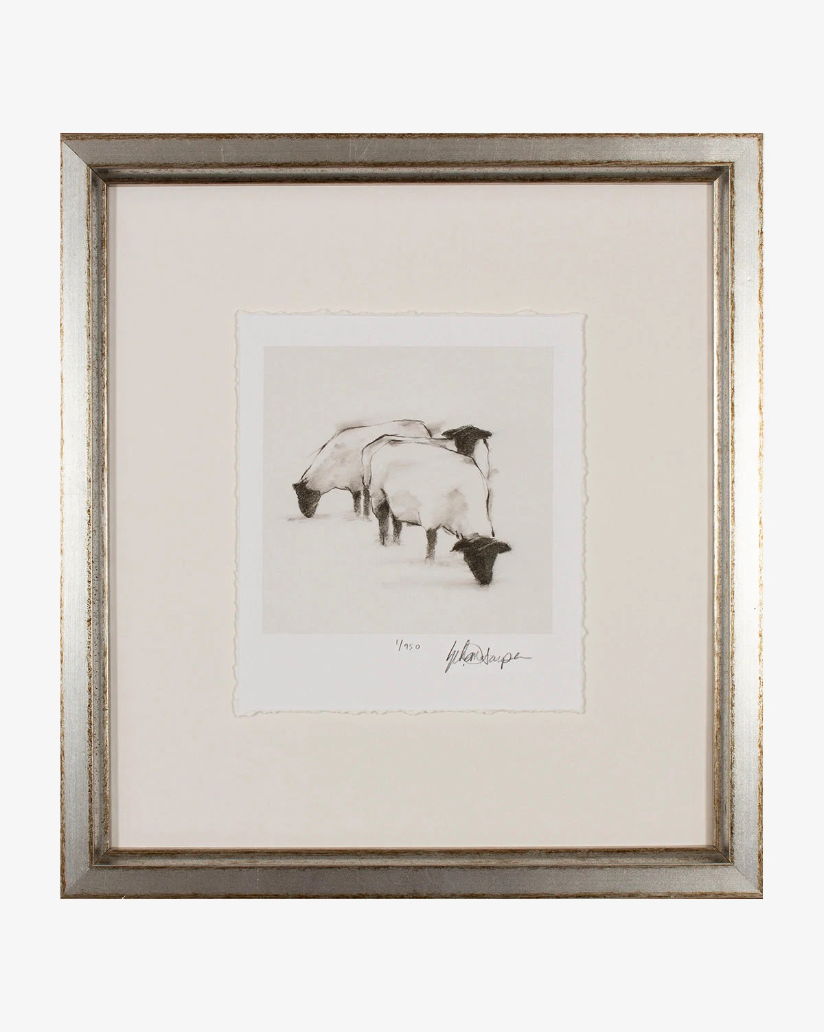 A simple sketch with a monotone palette, Sheep II is subtle yet expressive, reminiscent of imaginative illustrations. Framed within a wood frame with a silver finish, the piece is a charming accent to any children’s room.