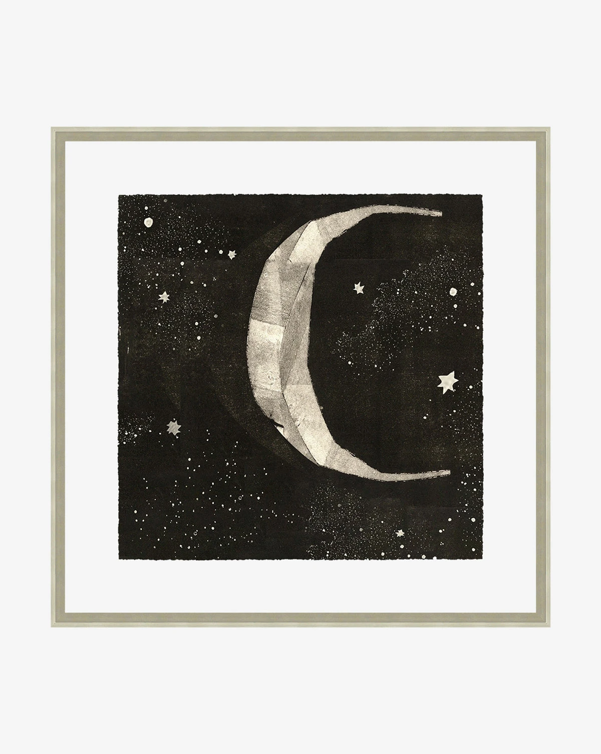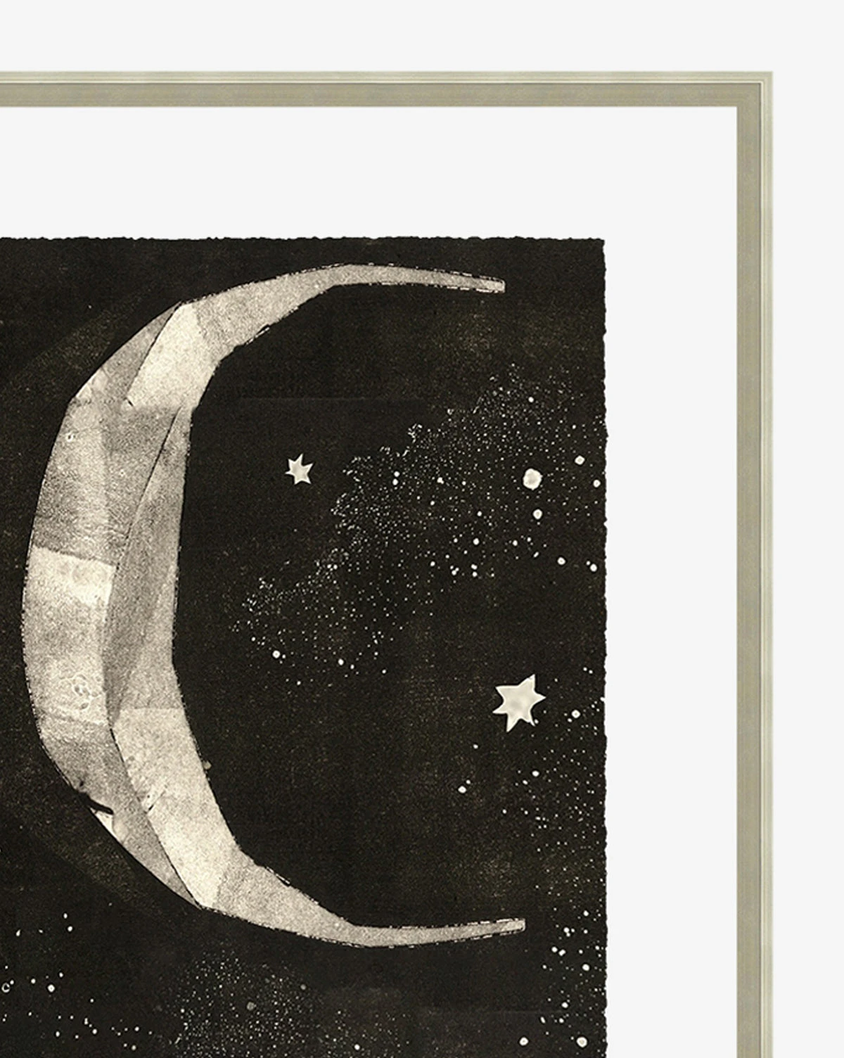 In a dreamy monochromatic palette, The Night Sky is a giclee piece on hand deckled paper. Eclectic in style, small flurries of stars that vary in both size and detail surround an imaginative, angled moon. The moon is designed with panels of contrasting shades of gray, giving dimension to the piece. Uniquely creative and floated on mat, The Night Sky is a beautiful addition to restful nurseries and bedrooms.