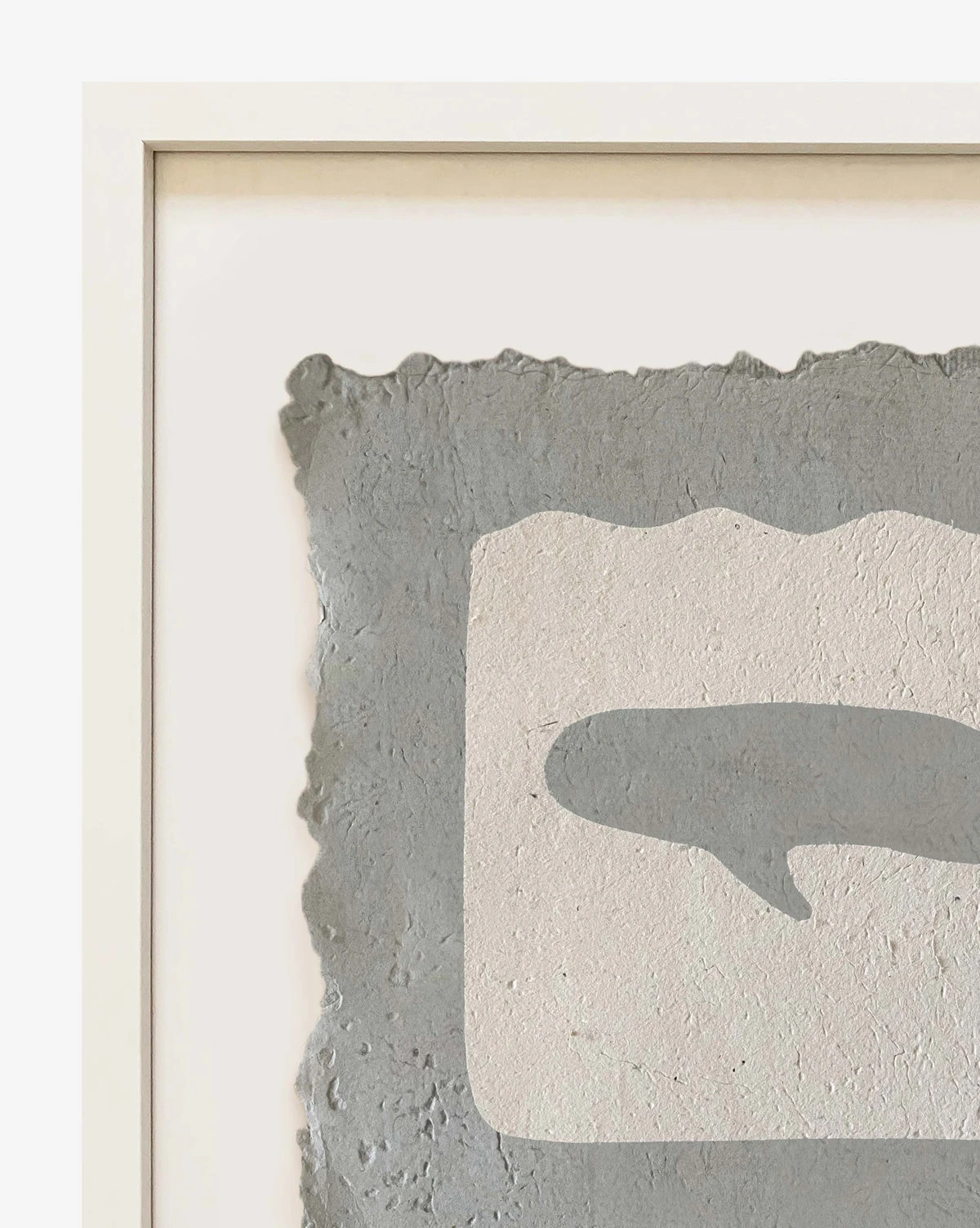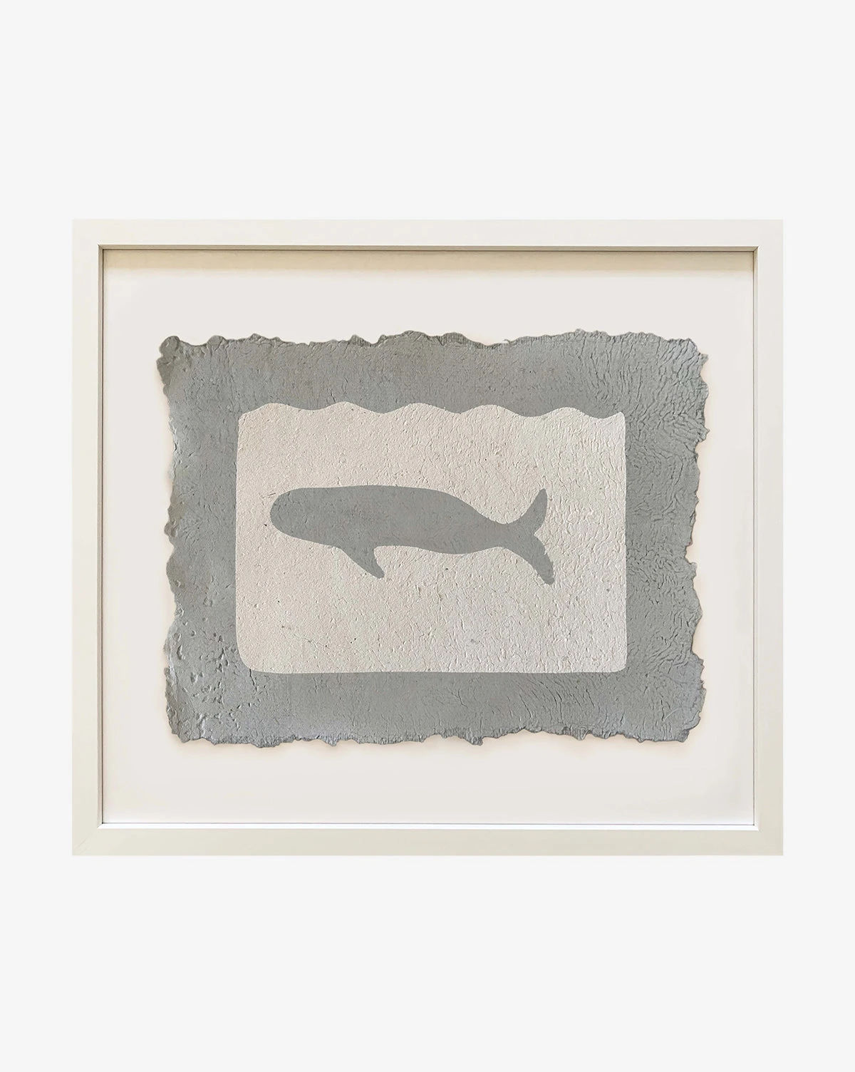 The Whale Silhouette brings imagination to the room. Silkscreen printed on handmade paper with textural torn edges, this piece of children’s artwork is floated in a matte white frame to highlight its intentional, organic design.