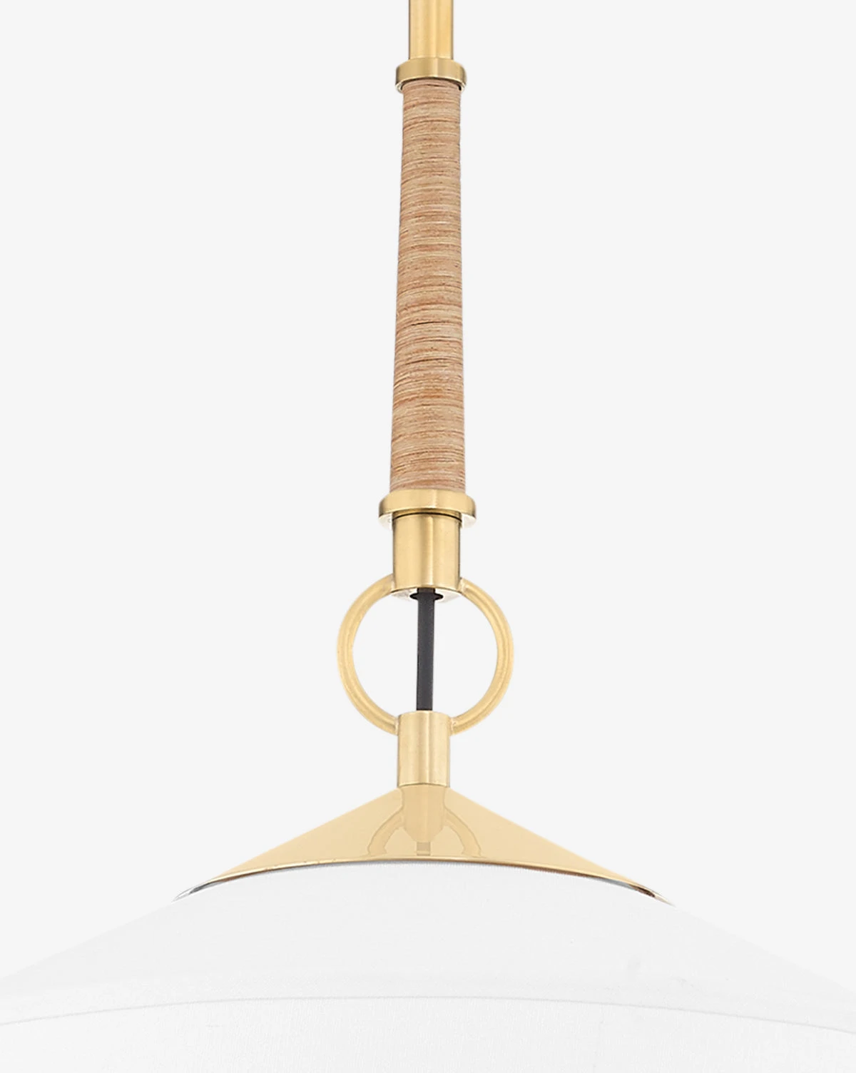 With an unmistakable silhouette, the White Plains Pendant brings new light to classic designs. A rattan-wrapped rod and a frame of aged-brass metalwork complements its dramatic drum shade, which is topped with a beautiful conical finial. Its enclosed shade diffuses the light in a soft glow, creating an ambience in your space that is endearing and elegant.